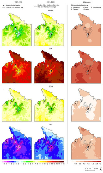 Spatial variability of mean seasonal (MAM, JJA, SON, DJF) temperatures (°C) in the northern Moravian Mts. region in the 1961–1990 and 1991–2020 periods and their difference.