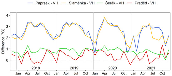 In order to validate the temperature measurement at the recently built meteorological station at Vysoká hole (from November 2017 to December 2021), the acquired series were compared with the measurements at other stations. As Figure 9 shows, the lowest differences were recorded between Vysoká hole and Praděd (mean monthly temperature difference 0.4 °C) and Šerák (0.8 °C) because these stations are situated at similar elevations (see Table 1). Presumably, the highest differences appeared between the Vysoká hole and the two remaining lowest-situated stations (2.6 °C for Paprsek, 2.5 °C for Slaměnka). The highest monthly difference between compared stations was recorded in April 2020 at the Paprsek and Slaměnka stations (congruently 3.8 °C).