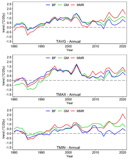 20-year moving trends of annual TAVG, TMAX, and TMIN between the northern Moravian mountain ridges (MMR) and the Giant Mts. (GM) and the Bohemian Forest (BF) in the 1980–2020 period.