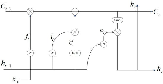 The LSTM predictive model, proposed by Hochreiter and Schmidhuber, has been used as an advanced version of RNN networks, overcoming the limitations of RNN networks by using hidden layer units called memory cells. The storage unit has a self-connection that stores the temporal state of the network and is controlled by three gates, called the input gate, output gate, and forget gate [,]. The basic structure of LSTM is shown in Figure 1 below.