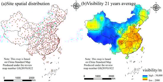 Spatial distribution of regional visibility in China. (a) Spatial distribution of stations; (b) spatial distribution of 21-year average visibility.
