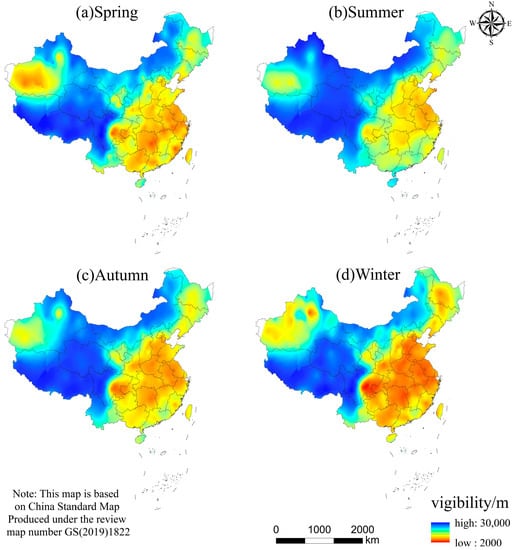 Similarly, the daily average visibility data of all stations were first transformed into EC daily average data, and the spatial distribution of visibility seasons was obtained according to the method in Figure 2. Observing the distribution areas of high, medium, and low values of visibility, the spatial distribution of visibility in the four seasons in the four pictures in Figure 3 is basically consistent with the spatial distribution of the average visibility in 21 years. Overall, the average visibility is highest in summer and lowest in winter.