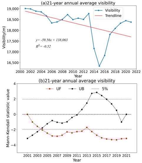 The MK mutation point test for the year-by-year averaged visibility data is plotted in Figure 4b, where the intersection of the red line (UF curve) and the black line (UB curve) is between the two critical straight lines at , satisfying the 95% confidence level. The values of UF curves were less than 0 from 2001 to 2021, indicating a decreasing trend in visibility from 2001 to 2021, which is consistent with the conclusion obtained from the interannual trend, and the decreasing abrupt change is known to be around 2003 by observation, where the UF value exceeds the critical value after 2004, so the decreasing trend in visibility in the Chinese region is significant after 2004.