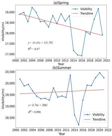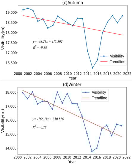 Interannual variation in visibility in four seasons. (a) Spring, (b) summer, (c) autumn, and (d) winter.
