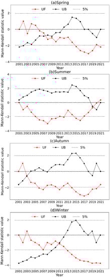 The MK mutation point test (shown in Figure 6) was performed on the four-season visibility data for the Chinese region from 2001 to 2021, and it can be seen that the UF and UB curves have only one intersection point for all four seasons during these 21 years, and the intersection points are all within the critical value , which has some reference significance. Observing the winter UF curves, the values of UF are less than 0 from 2004 to 2021, and the intersection of UF and UB is in 2011, which indicates a general decreasing trend n visibility in winter from 2004 to 2021, and the decreasing abrupt change in visibility occurs around 2011. Among them, the UF curve of winter visibility exceeded the critical value after 2013, indicating a significant decreasing trend in winter visibility after 2013. Similarly, observing the UF and UB curves in summer, we can obtain the sudden change point in summer around 2019. The UF curves for both spring and fall were less than 0 after 2006, indicating that both spring and fall visibility showed an overall decreasing trend after 2006, and the UF values for spring and fall exceeded the critical values around 2014, which indicates a significant decreasing trend in spring and fall visibility after 2014.