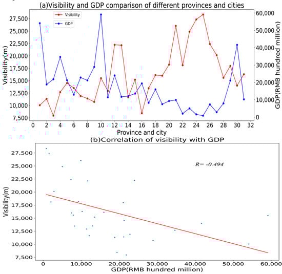 The average values of regional gross domestic product from 2002 to 2021 were obtained for each of the 31 provinces and cities in the Chinese region, the average values of visibility from 2002 to 2021 were also obtained for each of these 31 provinces and cities, and the relationship between the economy and the corresponding visibility of different provinces and cities was plotted. Table 1 shows the serial numbers corresponding to the different provinces and cities in the Chinese region. As shown in Figure 11, the Pearson correlation coefficient between the economy and visibility of different provinces and cities is −0.494, and there is a strong negative correlation between the two, and the visibility of provinces and cities with a higher economy is generally lower; for example, the average value of the GDP of Jiangsu Province in the past 20 years is 541.29 billion yuan, but the average value of visibility is only 10,049.4 m. The visibility corresponding to the provinces and cities with lower economy is generally higher; for example, the average value of the GDP in Tibet in the past 20 years is 83.398 billion yuan, and the average value of visibility is as high as 28,330.5 m.
