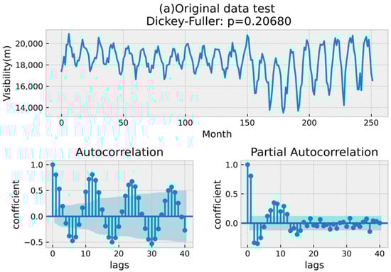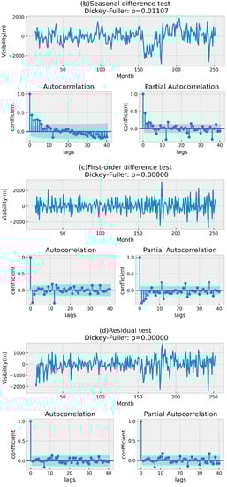Using the monthly average of 252 months of visibility in China from 2001 to 2021 as the original forecast data, Figure 12a shows the time series of the original data and its autocorrelation and partial correlation diagrams. The lag coefficient in the autocorrelation diagram is set to 40. Observing the visibility raw time series, we can see that it has obvious seasonality, the visibility varies in the range of 13,500 m to 21,000 m, and there are some decreasing and increasing trends. The Dickey–Fuller unit root test was performed on the original series and yielded a p-value = 0.2068 > 0.05, which means that the null hypothesis was accepted and the original visibility time series was determined to be non-stationary. The first thing needed to construct the SARIMA model is a smooth series, so the seasonality of the visibility time series should be eliminated and the seasonal difference should be processed, and since the year is 12 months, the seasonal length is set to 12 to obtain the seasonal difference test (Figure 12b). It was observed that the p-value = 0.01107 < 0.05; among the Dickey–Fuller unit root test, the periodicity of the shaded part in the autocorrelation plot disappeared, and the seasonality of the original visibility time series was eliminated and changed to a smooth series. Due to the presence of the trend term in the series, there were still more significant time lags in the autocorrelation and bias correlation plots, so it was necessary to continue the first-order differencing process. Figure 12c shows the test plot obtained by first-order difference processing. From Figure 12b,c, the visibility time series changes from irregular oscillation above and below 0 to stable oscillation above and below 0. The p-value is =0.00000 in the Dickey–Fuller unit root test, and the p-value is less than 0.01 based on white noise test. The visibility time series at this point can then be used for prediction model construction.
