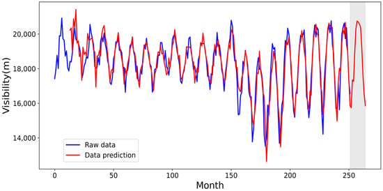 The predicted time series of visibility in China for the next 12 months are plotted as shown in Figure 13, where the horizontal coordinates represent months and the vertical coordinates are visibility. The blue line in the figure represents the original visibility time series, the red line represents the visibility prediction time series, and it can be observed that there is a high degree of overlap between the two. The evaluation index of the prediction model was calculated, and the root mean square error (RMSE) was 655.56, the mean absolute percentage error (MAPE) was 0.028%, and the goodness of fit () was 0.807. The SARIMA prediction model constructed in this study has a high prediction accuracy and good results. The shaded part has a slight fluctuating upward trend of visibility for the next 12 months in the Chinese region, which has some reference value.