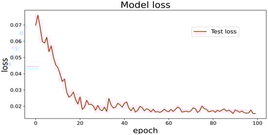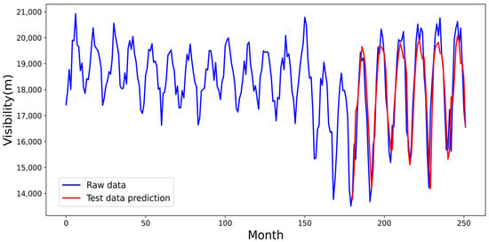 Through model training, the prediction series of regional visibility in China is obtained, as shown in Figure 14 below. The red line is the prediction result for a total of 72 months, the relevant assessment index is obtained, the RMSE is 921.71, MAPE is 0.041%, and the is 0.776, which is a good prediction effect of the model. As shown in Figure 15, observing the loss function curve, the loss error is stable at 0.02 up and down around 40 times for training, the model accuracy is high, and the error is small compared with the real value.