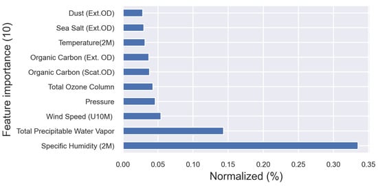 Figure 2. The first top ten crucial variables from the feature importance list contributed to the XGBoost regressor model training in terms of their percentage contribution normalized to 1.