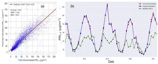Figure 3. (a) The scatter plot represents the correlation between model-predicted PM2.5 and Phora Durbar ground-based observations for the testing dataset. The red line represents the best-fit line with the equation along with r2-score, RMSE, and MAE. (b) Monthly average time series of truth (Phora Durbar), predicted randomly selected 20% testing data, and MERRA2 PM2.5 mass concentration. The blue line with a closed circle represents the predicted PM2.5 mass concentration from the model; the red line with a square is the true ground-based Phora Durbar station data; and the green line with a closed circle represents the MERRA2 data.
