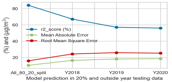 The full metrics analysis of all these tests is shown in Figure 4. As seen from the figure, compared to the metrics derived using the 80/20% split, the r2-score decreased, and the MAE and RMSE increased. For example, the r2-score is 67% for the 2018 testing, the MAE is 16.35 µg/m3, and RMSE is 24.23 µg/m3, while the corresponding values when using the 80/20% split are 84%, 10.27 µg/m3, and 15.82 µg/m3, respectively. This is expected because, for the 80/20% split, data from all years are sampled; the test data likely share the same distribution as the training data since they are from the same years. When the entire year is used for testing, the data distribution patterns can differ from the training dataset. In this regard, the test result for the year 2020 is especially suited for evaluating the model’s performance because the aerosol data patterns can be very different due to the pandemic lockdowns. However, the model still performed well, with an r2-score of 56%, an MAE of 18.52, and an RMSE of 25.3 µg/m3.