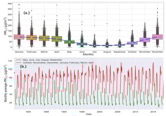 Figure 6. (a) Monthly grouping of the entire year’s statistics of the model predicted hourly PM2.5 mass concentrations from 1980 to 2021, showing lower PM2.5 concentrations from May to September with the mean of each month and showing interquartile range and overall distribution among the interquartile range. The center lines of each box represent the median, while the top and bottom margins represent the higher (Q3) and lower (Q1) quartiles, respectively. Two whisker caps are the maximum and minimum for each month. (b) Monthly mean PM2.5 dry and rainy month’s groups show the seasonality for years.