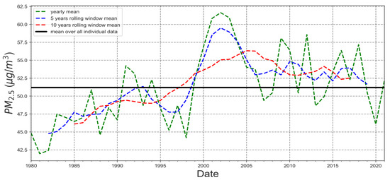 Figure 7. The various mean yearly, half-decadal, and decadal rolling mean for entire years predicted PM2.5 representing the concentration distribution over the past four decades over Kathmandu Valley. The black horizontal line represents the mean of all hourly data from 1980 to 2021.