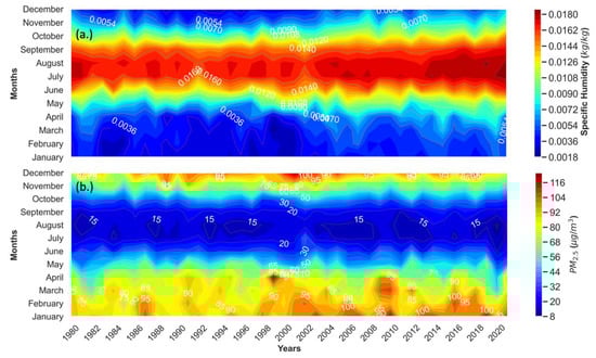 Figure 8. (a) The monthly distribution of the MERRA2 hourly specific humidity; (b) Monthly PM2.5 mass concentration distribution.