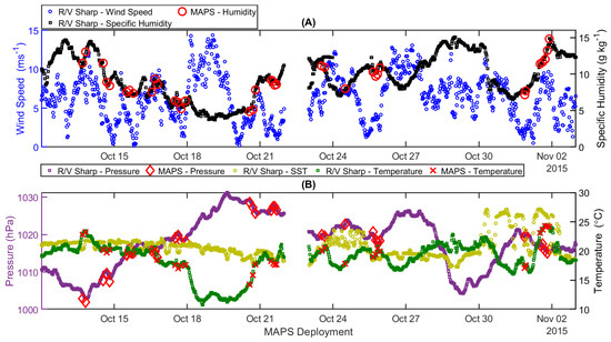 Time series of meteorological variables measured aboard the R/V Sharp and based-on the 7th-order polynomial fit of the MAPS data. (A) Shows wind speed and specific humidity and (B) shows air temperature, sea-surface temperature, and air pressure (see legends). All meteorological parameters were measured at an altitude of 12 m above mean sea level and are displayed for all MAPS deployment times during the CASPER-East field campaign (Table 1).