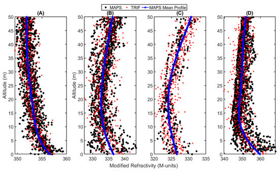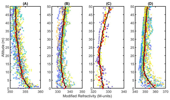 Example MAPS datasets corresponding to datasets 2 (A), 11 (B), 9 (C), and 33 (D) (Table 1). Circles represent the modified refractivity computed via (1) from the instantaneous measurements obtained from MAPS, where the black line is the 7th-order polynomial fit representing the mean refractivity profile, and the red line represents a 1 m bin-averaged profile. Colors included for the instantaneous refractivity measurements correspond to different launches (single ascent and descent) of MAPS.