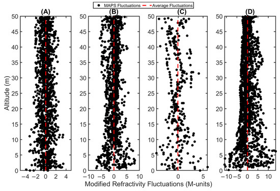 MAPS measurements of p, T, and RH have been thoroughly verified [10,12,13,14]. This paper focuses on the modified refractivity estimated from these measurements. MAPS datasets used in this study are displayed in Table 1, showing that 36 deployments of the system were performed over the course of CASPER-East, and on average each deployment lasted 26 min and contained ~1158 samples. Numerous ascents and subsequent descents of MAPS occurred during each deployment, where the following use of the term “launch” will describe one ascent/descent of the system, each lasting on average ~3.5 min. For each MAPS deployment, multiple launches occurred. For this study, MAPS refractivity estimates were truncated above 50 m to remove measurement uncertainties occurring due to reorientation of the system from ascent to descent [13,14]. In Figure 2, 4 example deployments of MAPS from CASPER-East are illustrated, where the different marker colors indicate different launches of MAPS; the 7th-order polynomial fit represents the mean; and, for comparison, a 1 m altitudinally binned mean profile is shown for each dataset, with the former utilized as the mean profile in this study. MAPS measurements, and subsequent estimates of refractivity, individually can be considered instantaneous (within the longest response time of the sensors of <2 s) and can thus be decomposed as