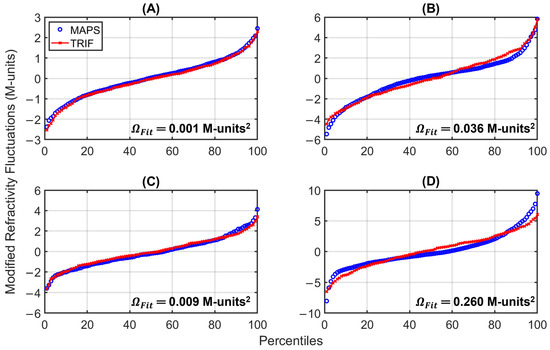 where is the for the Pth percentile computed for either the MAPS dataset,, or the TRIF model dataset, . = 100, corresponding to the hundred quantiles delineated for each dataset. Minimization of (10) ensures that the statistical characteristics (i.e., mean, median, and variance) of , for both TRIF and MAPS, are similar. Thus, relatively small would indicate that the TRIF model appropriately estimates the distribution of MAPS refractive index fluctuations. Example MAPS and TRIF quantiles for MAPS datasets illustrated in Figure 2 and Figure 3 are displayed in Figure 4.