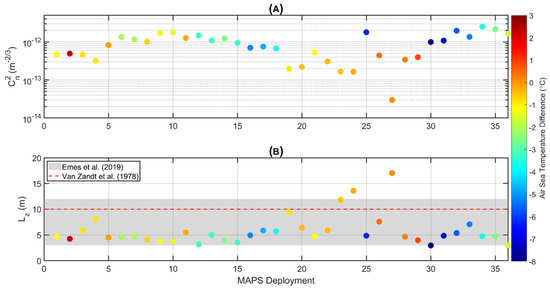 (A) Refractive index structure constant () estimated via NAVSLaM from the environmental variables displayed in Figure 1 for each MAPS deployment. (B) solutions from the particle swarm optimization corresponding to each MAPS dataset. Included in (B) are previously reported ranges of in the atmospheric surface layer (at ~12 m above the boundary) from [26] for differing atmospheric stability regimes (gray shaded region) and reported in [35] for the free atmosphere (10 m) (red dashed line). Marker colors denote the air–sea temperature difference in both panels.
