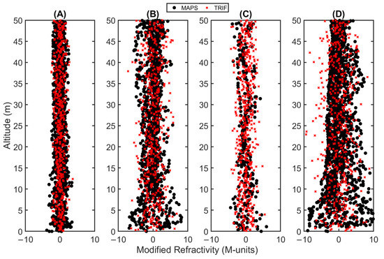 TRIF-modeled refractivity fluctuations using derived via PSO for the example MAPS datasets (2, 11, 9, and 33) are illustrated in Figure 6, and the associated instantaneous distributions of refractivity are displayed in Figure 7. For these examples, TRIF model fluctuations optimized to corresponding MAPS refractivity have a of 0.001 M-units2 (Figure 6A), 0.036 M-units2 (Figure 6B), 0.009 M-units2 (Figure 6C), and 0.260 M-units2 (Figure 6D), for MAPS datasets 2, 11, 9, and 33, respectively. The discrepancies between the for the examples displayed in Figure 6 are visually apparent. TRIF fluctuations mostly occur within the bounds of MAPS refractivity in Figure 6A–C, corresponding to relatively low ; this is not the case for Figure 6D. Most datasets (32 of 36) are on the order of the mean (0.047 M-units2) and are visually akin to Figure 6B. In Figure 6D, TRIF fluctuations tend to have a greater magnitude than MAPS refractivity at altitudes greater than ~8 m and fail to span MAPS fluctuations below this 8 m altitude. Consequently, MAPS dataset 33 corresponds to the largest (worst) relative to all MAPS deployments. This vertical inhomogeniety is not accounted for in the TRIF model as turbulence is assumed homogenous with altitude—i.e., and are estimated as one value for the entire profile.