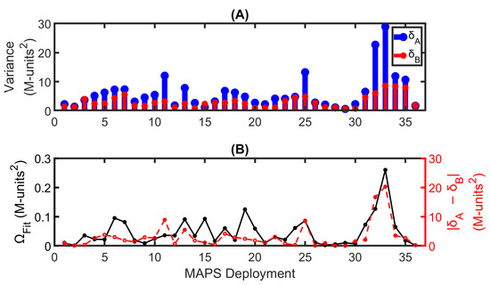 (A) Altitudinal variance in MAPS refractive fluctuations (). variance displayed for altitudes spanning 0–10 m and 10–20 m, and , respectively. (B) The left axis illustrates fitness scores (Equation (10)) corresponding to the MAPS/TRIF optimizations for each dataset in black, shown in Table 1. The magnitude of difference in MAPS refractive fluctuation variance between the 0–10 m and 10–20 m altitudinal bins ( is illustrated in red on the right-hand axis.
