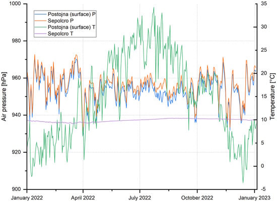 In Postojna Cave, the year-round comparison between the air pressure dataset and measurements outside the cave (Figure 2) shows synchronised behaviour between the cave and the surface at 12 h intervals. The difference in air pressure is due to the different altitudes of the measuring instruments. Even 2 min measurement intervals did not result in delays between air pressure measurements at the surface and in the cave [1].