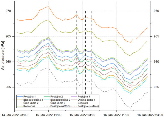 The second pressure wave (over the South Pole) at 02:00 CET (01:00 UTC) on 16 January 2022 is about 0.2 hPa and is not visible at all sites, but only at Postojna 2, Otoška Jama 1, Biospeleološka 1, and Koncertna Dvorana (Figure 3). All three air pressure peaks are clearly visible at our Baro-Diver® site outside the cave (Postojna surface in Figure 3), but less clearly at the national weather station in Postojna [15].
