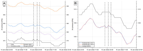 (A) Atmospheric pressure at Škocjan Caves and outside the caves [15] in hPa, 15–16 January 2022. (B) Atmospheric pressure at Kostanjevica Cave and outside [15] in hPa, 15–16 January 2022. Vertical dashed lines represent: 1—pressure signals at 21:00 CET (20:00 UTC); 2—pressure signals at 00:00 CET (23:00 UTC); and 3—pressure signals at 02:00 CET (01:00 UTC).