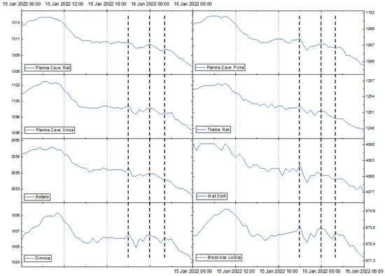 The change in the signal is almost identical at all the karst water monitoring sites with the exception of Planina Cave: Rak. Between 20:00 and 21:00 CET (19:00–20:00 UTC) on 15 January 2022, there was a slight increase of, on average, 0.35 hPa (maximum Mali Obrh—0.65 hPa; minimum Planina Cave: Rak—no change recorded) and a decrease of, on average, 1.47 hPa between 21:00 and 22:00 CET (20:00–21:00 UTC) (maximum Mali Obrh—3.23 hPa; minimum Planina Cave: Rak—0.82 hPa), again corresponding to the first HTHH pressure wave over the North Pole [18]. The long-range pulse at 00:00 CET (23:00 UTC) [31] and the second pulse on 16 January 2022 at 02:00 CET (01:00 UTC) were also observed at karst water monitoring sites.