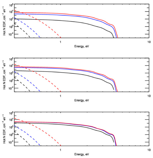 The energy distribution functions (EDFs) of the suprathermal N(4S) atoms at the heights of 102.5 (black lines), 113.0 (blue lines), and 125 km (red lines) in the Earth’s polar atmosphere. Calculations were conducted for the considered Cases A (upper panel), B (middle panel), and C (bottom panel) of the precipitating fluxes of auroral electrons. Dashed lines correspond to the local Maxwellian distributions of atmospheric N with the parameters calculated by the MSISE90 empirical atmospheric model (see Figure 1).