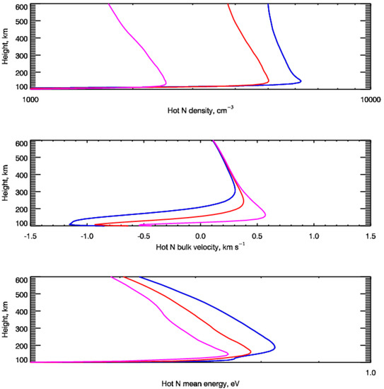 Knowing the steady-state EDFs of the suprathermal N atoms at each height allows us to calculate their height profiles of hot nitrogen in the polar atmosphere of the Earth. In Figure 3, the calculated height profiles of the number density (upper panel), bulk velocity (middle panel), and mean kinetic energy (bottom panel) of the suprathermal N(4S) atoms in the polar atmosphere of the Earth are demonstrated. These atoms were formed due to the influx of auroral electrons with an energy flux of Q0 = 1 erg cm−2 s−1. As it was described above, the auroral electrons at the upper boundary were represented by a Maxwellian distribution by kinetic energy with the mean kinetic energies corresponding to the considered Cases A, B, and C of the auroral electron precipitation.