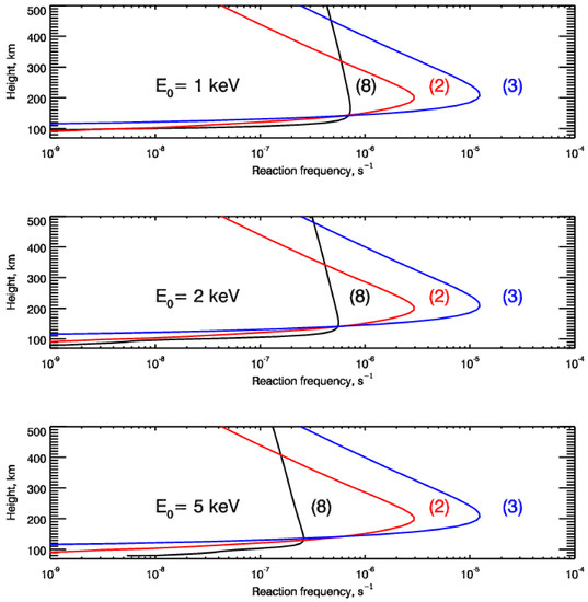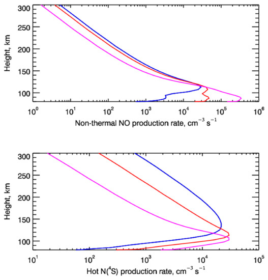 Results of our calculations are given in Figure 4 for the different levels of solar activity, i.e., Cases A, B, and C. The height profiles of the calculated reaction (8) frequency are shown by black lines in Figure 4. To compare with non-thermal NO production, the reaction frequencies for thermal NO production in reactions (2) and (3) are also shown by red and blue lines, respectively. These frequencies were calculated for atmospheric atomic nitrogen using the following rate coefficients: K3 = 1.45 × 10−16T1.6 × e−2894/T cm3 molecule−1 s−1 [44] for reaction (3); and K2 = 6 × 10−12 cm3 molecule−1 s−1 [45] for reaction (2).