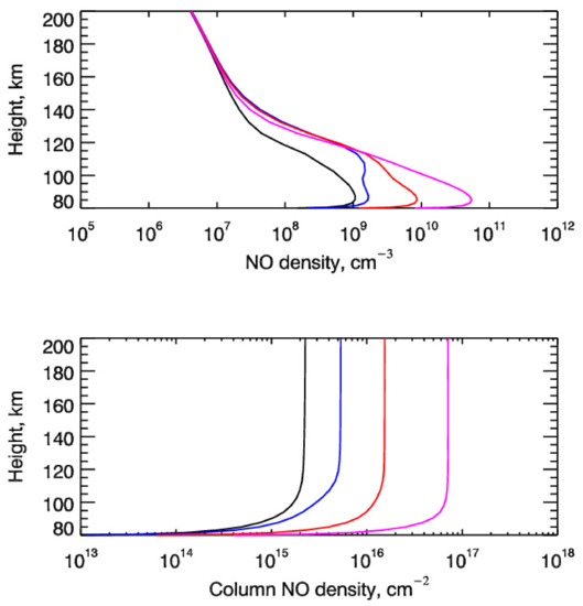 Results of calculations of non-thermal production of NO in the polar regions of the Earth’s upper atmosphere are presented in the top panel of Figure 6. In this figure, the height profiles of the NO number density calculated in the odd nitrogen chemistry model without (black line) and with (color lines) taking into account the input of the suprathermal N(4S) atoms through reaction (8) are shown. The height profiles of NO number density were calculated for the considered Cases A, B, and C of the precipitating auroral electrons with an energy flux of Q0 = 1 erg cm−2 s−1. The bottom panel represents the height profiles of NO column densities and its color palette is the same as the top one. Figure 6 evidently shows that the input of suprathermal N(4S) atoms to the non-thermal production of NO is important because the auroral electron precipitation caused by the disturbed solar conditions results in the significant increase in NO abundance in the polar regions of the Earth’s atmosphere. It is seen that the peak values of NO number density (top panel of Figure 6) and NO column density (bottom panel of Figure 6) increase by a factor of a few times: