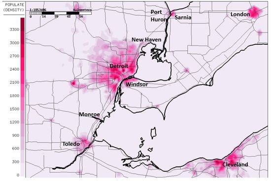 A map of the study region is shown in Figure 2. The Windsor West air quality site (latitude 42.292°, longitude −83.073°) is part of the Environment and Climate Change Canada’s National Air Pollution Surveillance (NAPS) network and is co-operated by the Ontario Ministry of Environment Conservation and Parks (OMECP). The Windsor West station is classified as an urban neighborhood site, operated from a schoolyard. NAPS stations continuously measure the mixing ratio of O3 using hourly data. VOCs are measured at Windsor West every 1 in 6 days using Xon Tech canisters with a 24 h sample time (00:00–24:00 EST), followed by gas chromatography and detection (flame ionization and mass spectrometry) []. There were 61 scheduled samples and 107 VOC species reported in 2018. The 107 VOCs consist of alkanes, alkenes, aromatic hydrocarbons, halogenated organics, and other organic compounds, as listed in Table S7.