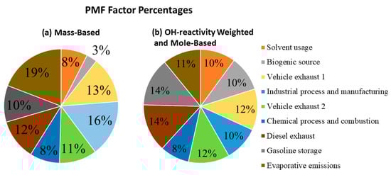 PMF factor identification by mass percentage (a) and OH-reactivity weighted mole percentage (b) from 2018 annual data at Windsor West. Solvent usage contributions of 8% and 10% are calculated by mass and reactivity-weighted, respectively. The reactivity-weighted factors are more evenly distributed.
