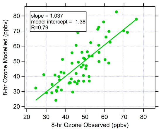 The 2.5-km GEM-MACH-TEB air quality model system was recently evaluated for O3 predictions in the Great Lakes region []. The same model system is used in this study but with updated emissions for a more recent meteorological time period. Figure 4 shows the correlation between 8 h daily maximum modelled O3 and 8 h daily maximum observed O3 between June and July 2018 at the Windsor West site. The correlation slope is 1.04, the model intercept is −1.4 ppbv, and the correlation coefficient is 0.79. The model performance is similar to the results from prior studies [] and peer air quality model systems [,,,,].