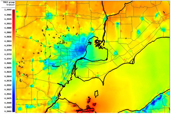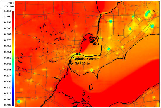 A sensitivity simulation was performed with a 10% VOC reduction in solvent emissions from applications. This method is referred to as the perturbation approach in the literature []. Small perturbations are selected for individual sectors that do not disturb the non-linear O3 chemical regime in the model. The ratio of the mono-substituted aromatics from the sensitivity and base simulations was calculated and averaged for daytime conditions over the summertime period (e.g., if the mono-aromatic mixing ratios decrease by 1% for a 10% sector emission change, this would represent an approximate 10% solvent use contribution). Figure 5 illustrates the corresponding mono-aromatic sensitivity for summertime and 8 h daytime conditions (averaged for 11 a.m.–7 p.m. local time). The average daytime aromatic ratio at Windsor West is 0.97 (3% decrease), which represents an approximate 30% contribution from the solvent emissions. The blue color in Figure 5 shows ratios of 0.93 (7% decrease) on both sides of the border, which represents an approximate 70% contribution. These are the industrial areas where solvents are applied. An analysis at Windsor West for all hourly model data showed a 3.8%, 1.5%, and 0.7% decrease for the 95th, 50th, and 5th percentiles, respectively, between the emission reduction and base case simulation.
