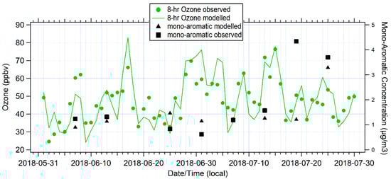 Figure 6 shows the modelled and measured time series for 8 h daily maximum O3 and 24 h mono-substituted aromatics (mainly toluene, ethylbenzene, and propyl-benzenes) at Windsor West. High O3 days at Windsor West are typically under light southwest winds []. This wind field was observed on 7 June, 17 June, 29 June, 13 July, and 19 July 2018, and was accompanied by warm temperatures and high O3 mixing ratios.