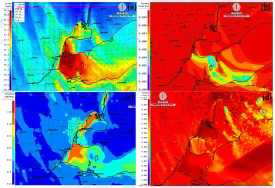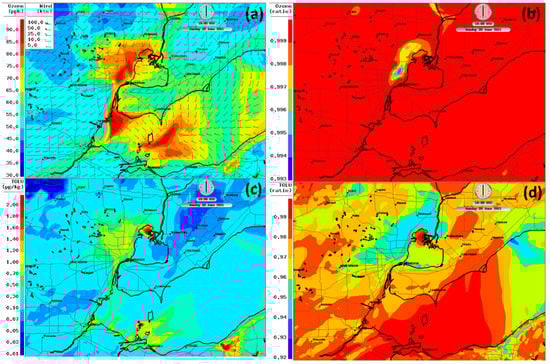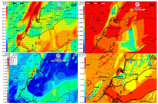 (a) Ozone and wind barbs predicted on 13 July 2018 at 20Z, (b) ozone ratio predicted from the 10% emission reduction simulation relative to the base simulation, (c) mono-aromatic concentration predicted, and (d) mono-aromatic ratio predicted from the 10% emission reduction simulation relative to the base simulation. Downwind of Windsor/Detroit, the ozone ratios were from 0.994 to 0.996 (0.4–0.6% reduction) on the eastern side of the ozone plume near Port Huron. The lowest ratios in Detroit (0.996 to 0.998) were also found along the lake breeze front to the west of Lake St. Clair (0.2–0.4% decrease). Mono-aromatic ratios of 0.97 to 0.99 were simulated in the Detroit/Windsor and downwind plumes, which represents a small 1–3% decrease.