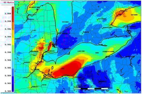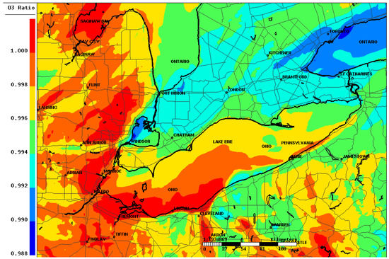 Average summertime 8 h daytime ratio of the predicted ozone from the 10% mobile emission reduction simulation relative to the base case simulation. Low ratios of 0.988 to 0.991 are simulated for Eastern Detroit (0.8 to 1.1% decrease, green). The blue color over rural Michigan and rural Ontario corresponds to a 1.3–1.8% ozone decrease. The yellow color over Port Huron/Sarnia and Windsor corresponds to a 0.6–0.8% ozone decrease. Western Detroit, Toronto, and pollution plumes over the lakes have small ozone decreases shown in red.
