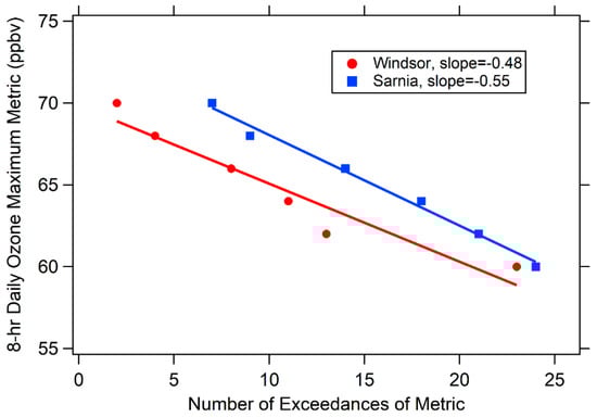 Correlation between the 8 h daily maximum ozone (in ppbv) and the number of exceedances of this metric at both Windsor West and Sarnia, Ontario. The slope (−0.5 ppbv) represents the average reduction in ozone (ppbv) needed to decrease the number of exceedance events by 1.
