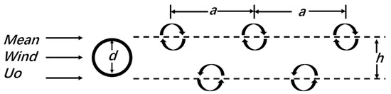Schematic plot of a Kármán vortex street generated by wind passing a cylindrical obstacle of diameter d. a is the vortex spacing and h is the width of the Kármán vortex street.