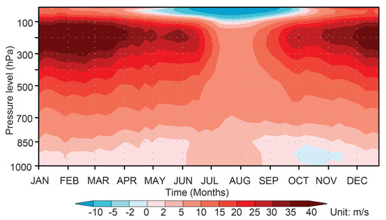 The Tibetan Plateau spans the region of approximately 26~40° N, 73~105° E. The grid of (40° E, 32° N) is located upstream of the Tibetan Plateau with an elevation of only 500 m and serves as a reference coordinate grid for the Tibetan Plateau. Figure 2 displays the mean seasonal cycle of the zonal wind at that grid. Strong westerlies prevail over the upstream region and over almost the whole troposphere from 1000 hPa to 100 hPa for a whole year. The minima of the westerlies occurred over the boreal summer.