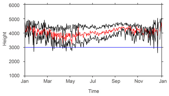 Red line: The seasonal variation in the climatological mean of the height of the dividing streamline hc of the Tibetan Plateau (unit: m). Black lines mark 1 standard deviation. The blue line is the threshold above which the stable AVS could exist.