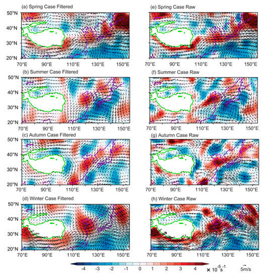(a–d) Fourier filtered horizontal structure of 4 cases in daily relative vorticity at 700 hPa for the period of boreal (a) spring (16 March 1992), (b) summer (1 August 1991), (c) autumn (15 September 2002), and (d) winter (15 February 2005) (unit: s−1). The green line marks the topography of the Tibetan Plateau. The vector exhibited the Fourier filtered 700 hPa horizontal wind field. (e–h) Same as (a–d) but for the unfiltered field replacing the Fourier filtered field.