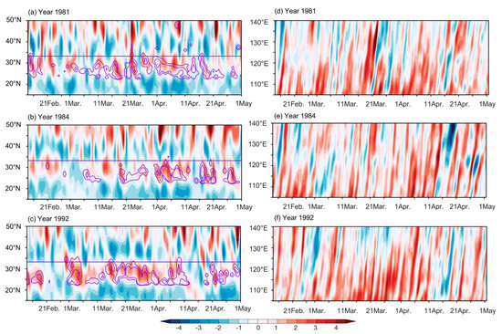 (a–c) Hovmöller diagram of daily relative vorticity at 700 hPa averaged over 110–120° E (unit: 10−5 s−1) for the period of February to April (winter to spring) in (a) 1981, (b) 1984, and (c) 1992. The straight line in panel a is used to represent 32° N, which is roughly the central line of the Tibetan Plateau. Precipitation averaged over 110–120° E was also exhibited by the purple lines (2 levels of 5 mm/day and 15 mm/day). (d–f) Hovmöller diagram of daily relative vorticity at 700 hPa averaged over 28–32° N from March to April in (a) 1981, (b) 1984, and (c) 1992 (unit: 10−5 s−1).