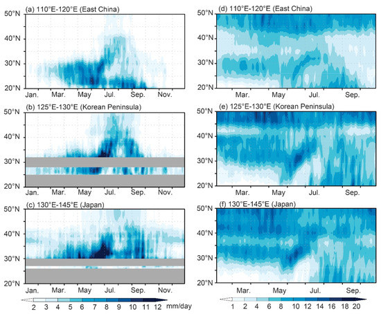 Hovmöller diagram of (a–c) daily precipitation derived from CPC datasets (unit: mm) and (d–f) daily relative vorticity at 850 hPa (unit: 10−6 s−1) averaged over (a,d) 110–120° E, (b,e) 125–130° E, and (c,f) 130–145° E. The results were smoothed by a pentad temporal domain. Gray represents missing records.