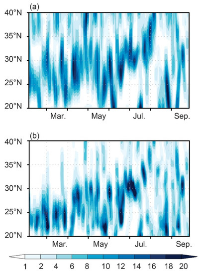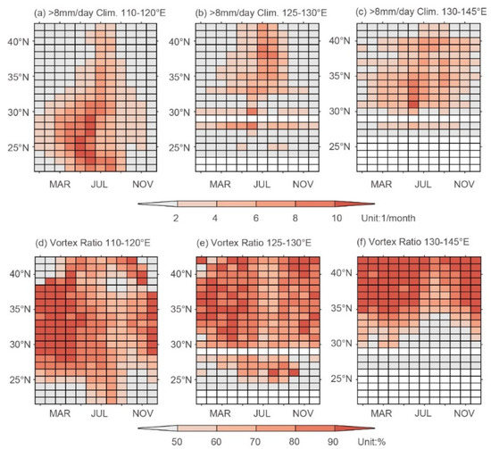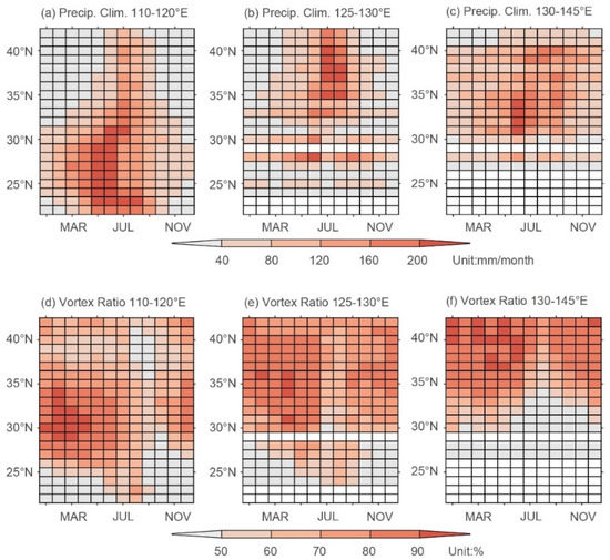 Figure 6 exhibits the seasonal variation in the climatological mean of the rainband and positive vorticity over 110–120° E, 125–130° E, and 130–145° E for the whole year. The rainband with precipitation exceeding 4 mm/day over these three regions began in the temporal span of March to September and the spatial span of the south to 32° N, and then the rainband penetrated northwards in the subtropics, propagating from 25° N to 40° N. Such a spatiotemporal structure was largely shared by that of positive relative vorticity. The correlation coefficients for the spatiotemporal domain were 0.178 (5691 samples, p < 0.01), 0.133 (p < 0.01), and 0.124 (p < 0.01).