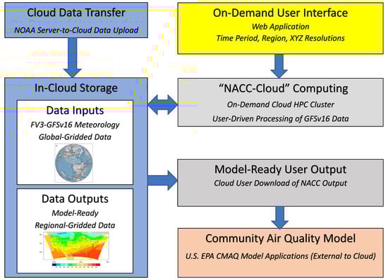 The global 3D, gridded GFSv16 data sets are very large (on the order of TBs/month), and thus it can be very cumbersome to use basic transfer and processing tools for usage in the scientific modeling community. Thus, the use of the cloud in this work is critical to provide the scientific community streamlined access to the near-real-time GFS forecast output and to facilitate user-defined NACC processing of GFS data to generate model-ready, meteorological input for any U.S. EPA Community Multiscale Air Quality (CMAQ) domain and air quality application worldwide (i.e., “NACC-Cloud” version 1) (https://nacc.arl.noaa.gov/nacc/, accessed on 1 July 2023). Cloud computing and storage platforms are desirable as they are highly customizable, on-demand, and much more scalable than traditional local servers. Such a cloud interface for GFS-driven CMAQ applications was not currently available and is advantageous to the air quality scientific community and beyond (Figure 1).